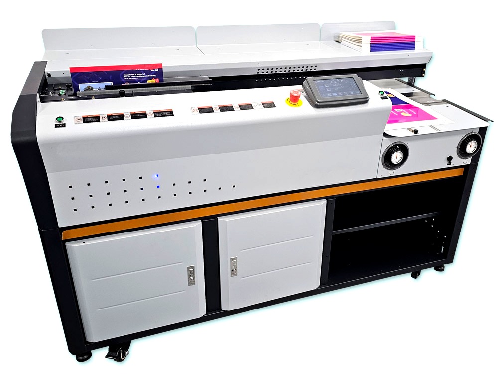 Der Klebebinder ist optional mit Feeder zum automatischen Rillen und zuführen der Bindemappen nachrüstbar. Somit ist diese Maschine schnell vom Halbautomaten zum Vollautomaten aufgerüstet.