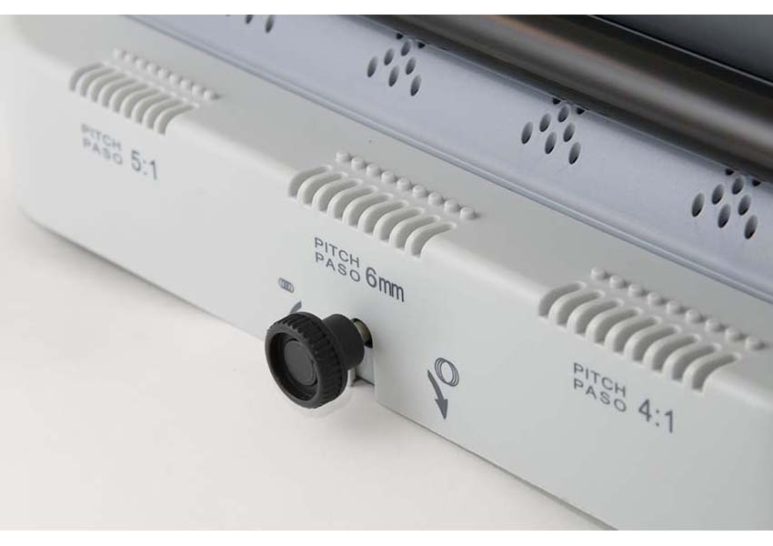 Dieser Coil-Finisher hat eine Arbeitsbreite von 330 mm. Durch die angetriebene Gummiwalze wird die Coilspirale in das vorgestanzte Papier eingedreht. Das Einziehsystem verfügt über eine höhenverstellbare Rolle, damit Sie das Gerät auf unterschiedliche Durchmesser von Coil-Spiralen anpassen können.